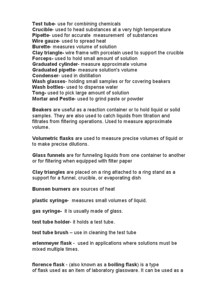 Be able to identify the name of each piece of equipment as well as its function or use in the laboratory.