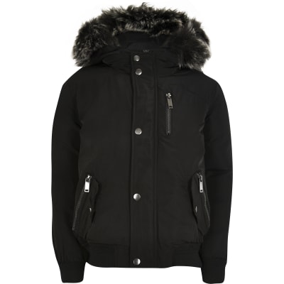 Black faux fur panelled cotton parka.